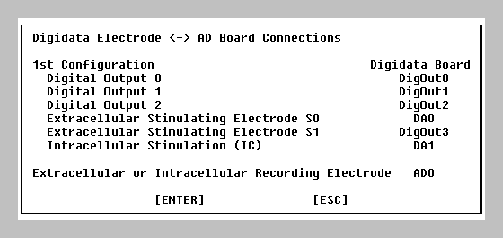 The Digidata board is one of the most popular data acquisition boards for neurophysiology, almost solely due to its use by the Axon Instruments program pClamp. The Digidata board also comes with its own interface, and the electrode <-> interface connections are based on using this interface. LTP113E uses the analog input channel AnalogIn0, the analog output channels AnalogOut0, AnalogOut1, and the digital output channels DigitalOut0, DigitalOut1, DigitalOut2, and DigitalOut3.