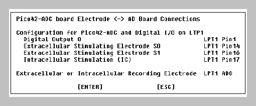 For an LTP experiment with one recording electrode (extracellular or intracellular), intracellular (IC) stimulation through the recording electrode (if applicable) and two extracellular stimulating electrodes (S0 and S1), connect the recording electrode amplifier and SIUs to Pico42 board on LPT1 and digital output through LTP1 as shown in the Pico ADC-42 / One Port Electrode Connections Help Box (Fig. 2.3.3). This information can be viewed in the LTP program by using the menu command: