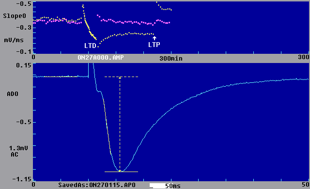The LTP program is a stimulation, data acquisition and on-line analysis program for studying Long-Term Potentiation (LTP), Long-term Depression (LTD), and related phenomena. It was primarily developed to get accurate on-line measurements of amplitude and slope in order to determine when a stable baseline had been achieved, and to be able to manually reset the amplitude and slope back to baseline.