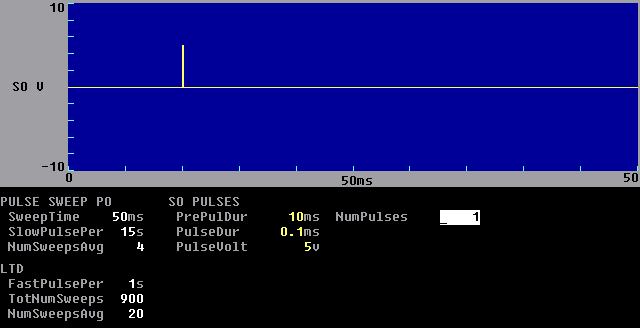The LTP Program is actually capable of generating four different sweep stimulations with different stimulation capabilities on each. Two sweep stimulations are Pulse Sweeps P0 and P1, and these are usually used for single pulse stimulation, can be repeated at set time intervals, and the sweep data can be signal averaged. The other two sweep stimulations are Train Sweeps T0 and T1, and these are evoked as single, nonrepetitive sweeps that are usually used for train stimulation.