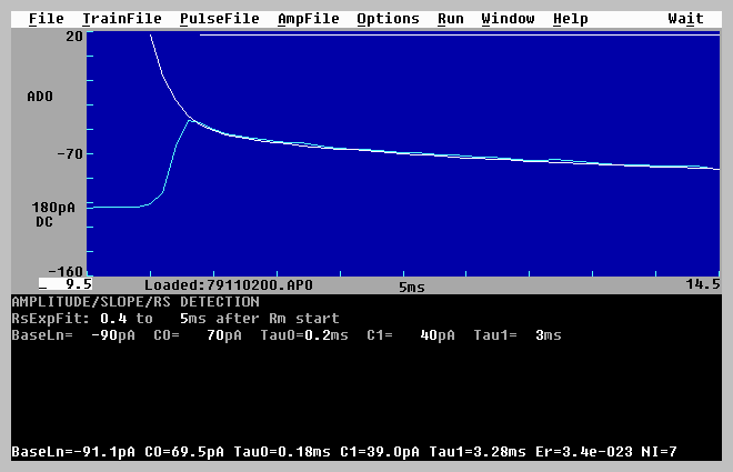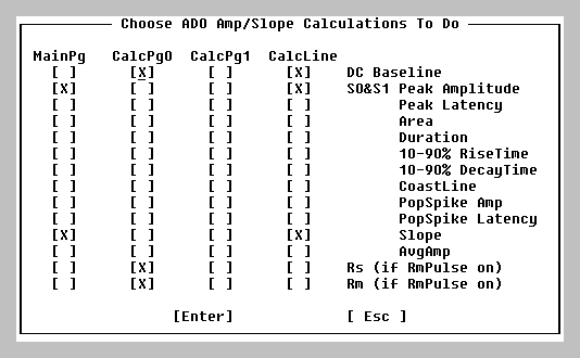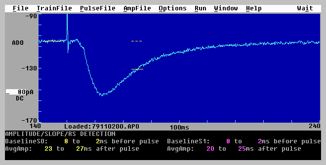| 5. | Choosing what synaptic response calculations to do (e.g. DC Baseline, Peak Amplitude, Peak Latency, Area, Duration, Rise Time, Decay Time, Coastline, PopSpike Amplitude, PopSpike Latency, Slope, Average Amplitude), and what Rm and Rs calculations to do. | |
