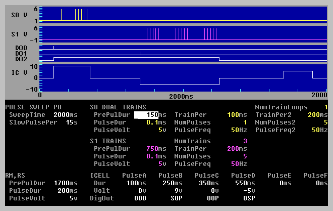 In normal LTP experiments, a Train T0 Sweep generates many (say 100) S0 pulse stimulations, and a eliciting a single Train T0 Sweep would deliver an S0 train stimulation to the preparation. Similarly, a Train T1 Sweep generates many S1 pulse stimulations, and a eliciting a single Train T1 Sweep would deliver an S1 train stimulation to the preparation.