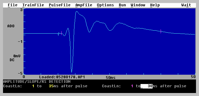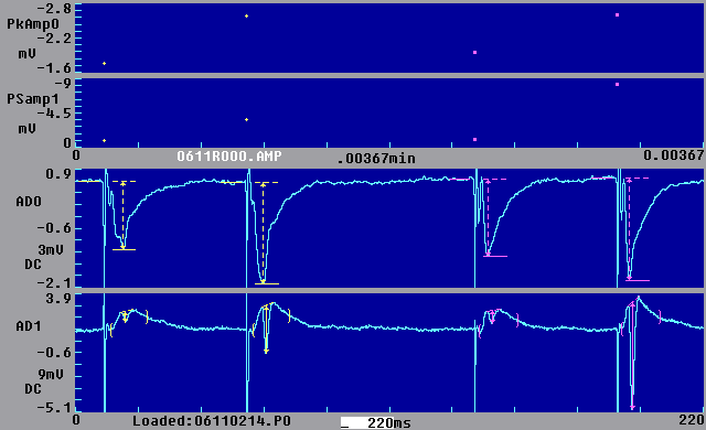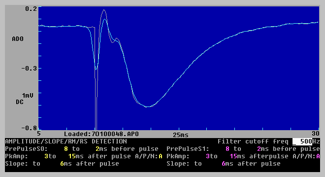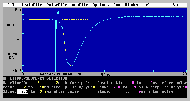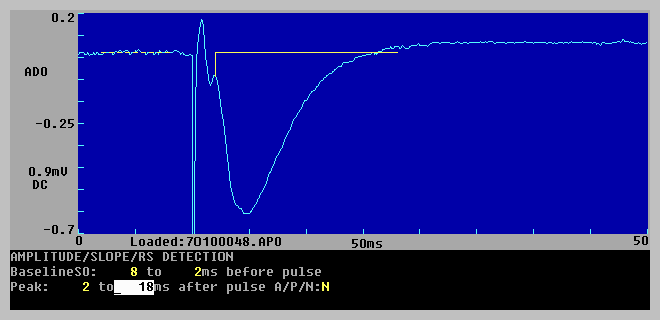 All these traces can be shown on the screen and saved to a data file, and almost all can be plotted on a laserjet printer (raw sweeps cannot be plotted during signal averaging). Calculations of slopes and peaks are made on the latest processed sweep. For example, if signal averaging, stimulus artifact blanking and digital filtering are being used, then the averaged, blanked and filtered sweep is the one that will be analyzed.