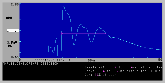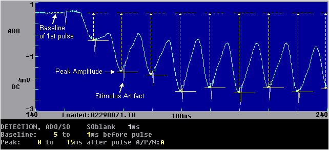 Fig. 4.9.1b,c shows the effect of stimulus artifact blanking. If Stimulus Artifact Blanking is chosen, stimulus artifact blanking is enabled, and a S0blank or S1 blank field appears on the Detection page (see Fig. 4.9.1b,c). Beginning at the time of the start of the S0 or S1 pulse to the time set in the S0blank or S1blank field (1 ms in Fig. 4.9.1), the stimulus artifact data in the ADsweep array is set to the average of the 1 data point value just before blanking begins, and one point value just after blanking ceases (see Fig. 4.9.1c). If the time in the S0blank or S1blank field is set too short, then the stimulus artifact is not entirely blanked, if it is set too long (but not rediculously long) generally there aren't any problems as long as the peak amplitude is not clipped.