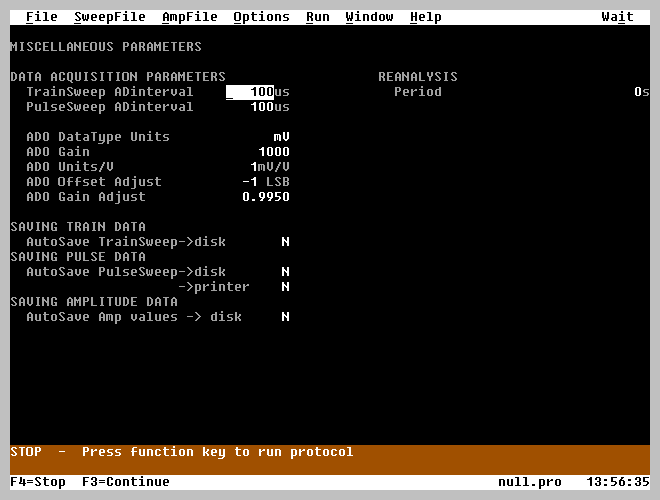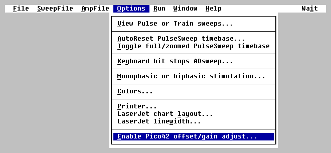 | Go to the PulseSweep P0 Stimulation Window (shown in Fig. 3.1.2) by pressing PgDn or PgUp until the correct window is reached. Alternatively use the menu commands (see Fig. 3.4.6A,B) |