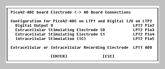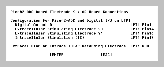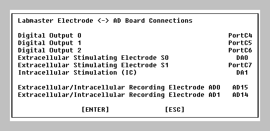 The electrode <-> interface connections for the LTP program are based on this TL-1 interface. LTP230D uses two analog input channels (physical AD channel AD15 for logical AD channel AD0, physical channel AD14 for logical channel AD1), two analog output channels DA0 and DA1, and four digital output channels C4, C5, C6 and C7. The input channels (AD15 and 14), and the output channels (DA0, DA1, Ports C4, C5, C6 and C7) are those commonly used by the Axon Instruments program pClamp 6, and the LTP230D program will automatically work on a computer set up to use pClamp 6.