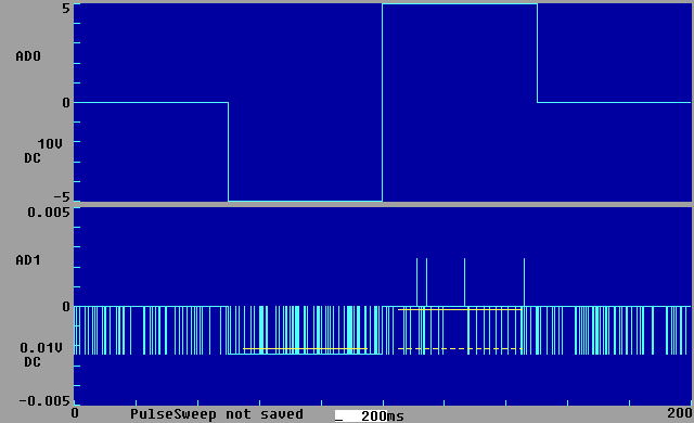 To directly testing the DAS08/JR or Labmaster board in the computer, connect the IC analog output to one AD channel (e.g. AD0) and ground the other AD channel (e.g. AD1). Put a -5 to +5 (or -10 to +10) volt signal of substantial duration (say 50 msec per pulse) out of IC. Change the AD0/AD1 DataTypes to "V", change the AD0/AD1 Gains to x1, and put the AD0 sensitivity to a low value (ca 10V (or 20V) peak-to-peak), and the AD sensitivity to a very high value (ca. 0.02V peak-to-peak). Then measure the shift in the grounded AD channel, AD1 (Fig. 2.9.3). Use AvgAmp (and therefore also Baseline) to record the shift in voltage by setting the Baseline cursors during the other AD0 channel's -5 (or -10) volt pulse, and the AvgAmp cursors during AD0 channel's +5 (or +10) volt pulse. Because analysis and reanalysis is done at the 16 bit level with the DAS08/JR boards, the values will be to within 1/16th bit. Analysis and reanalysis is still done at 12 bits on the Labmaster board. Also try different IC output voltage regemes.