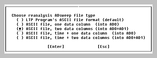 Choosing the the Set reanalysis ADsweep file type... option calls up the Choose reanalysis ADsweep file type dialog box (Fig 6.8). This allows you to change from the default LTP Program's ASCII file format (for LTP114J and earlier, or for LTP222A and LTP230D) to 1) one data column ASCII, 2) two data columns ASCII, 3) a time column (on the left) plus one data column ASCII (see the top of Fig. F2) , or 4) a time column (on the left) plus two data columns ASCII (see the top of Fig. E2).